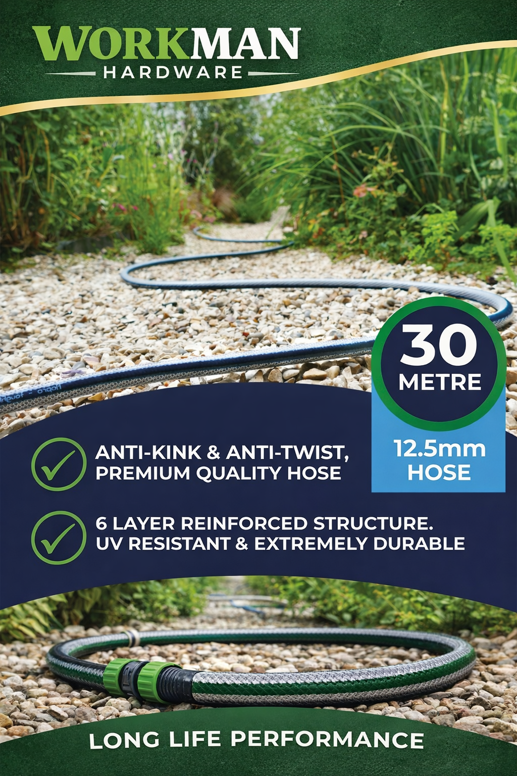 Workman 30m Garden Hose 12.5mm – Anti-Kink UV Resistant Heavy Duty